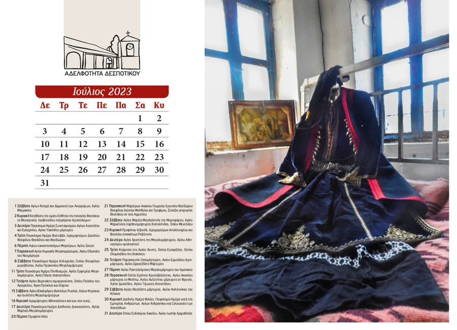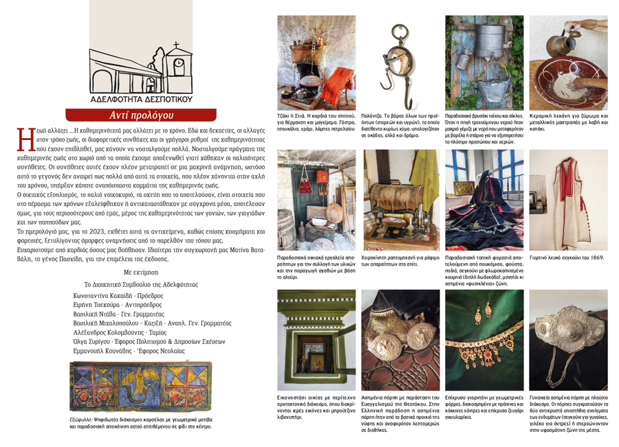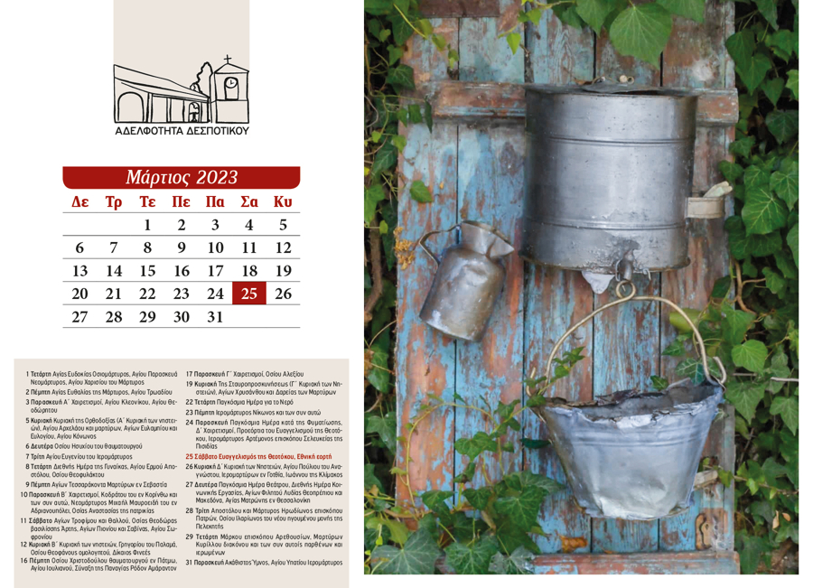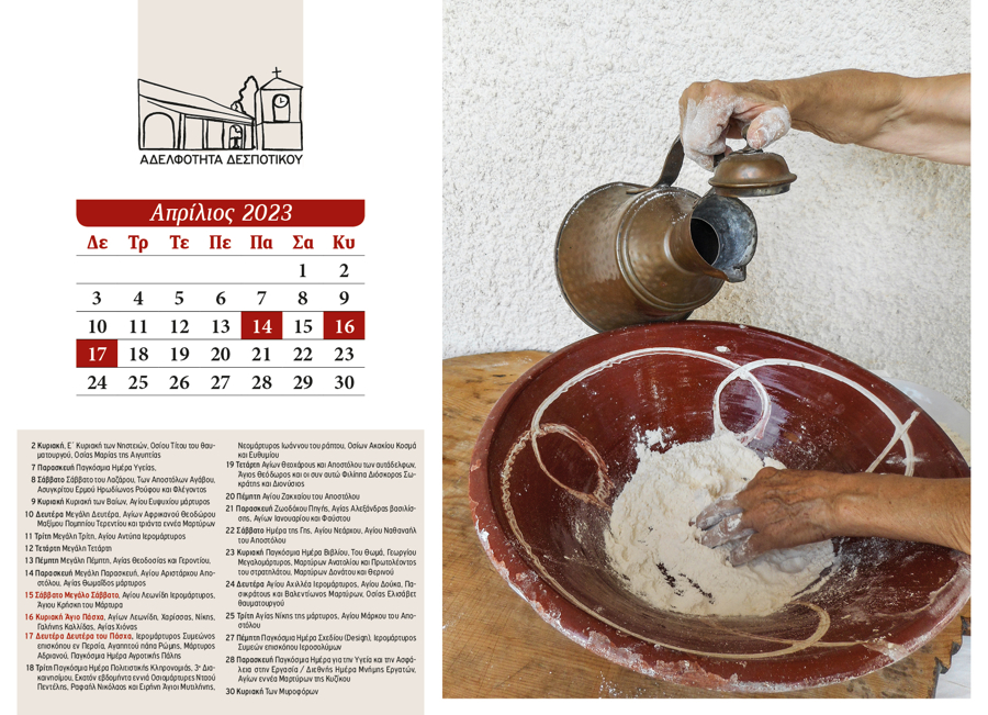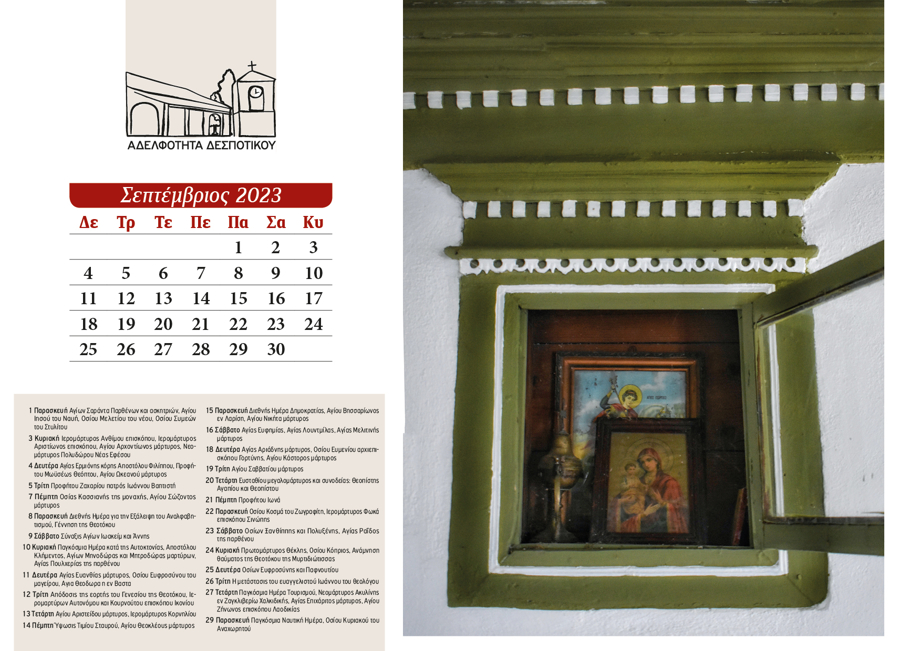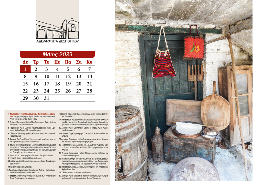 The 2024 calendar is dedicated to the landscape, memory, and quiet simplicity of Despotiko. Through photographs of natural and cultural landmarks—mountains, forests, springs, churches, monasteries, schools, and gathering places—it portrays village life as a continuous, shared experience. Nature, worship, and human presence coexist, turning the calendar into a subtle ritual of collective memory and reconnection.