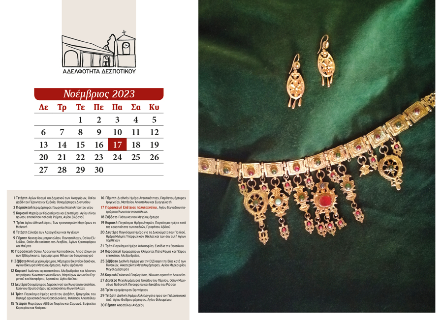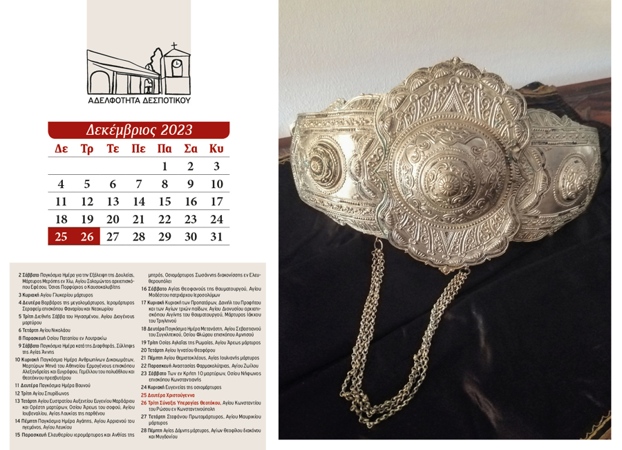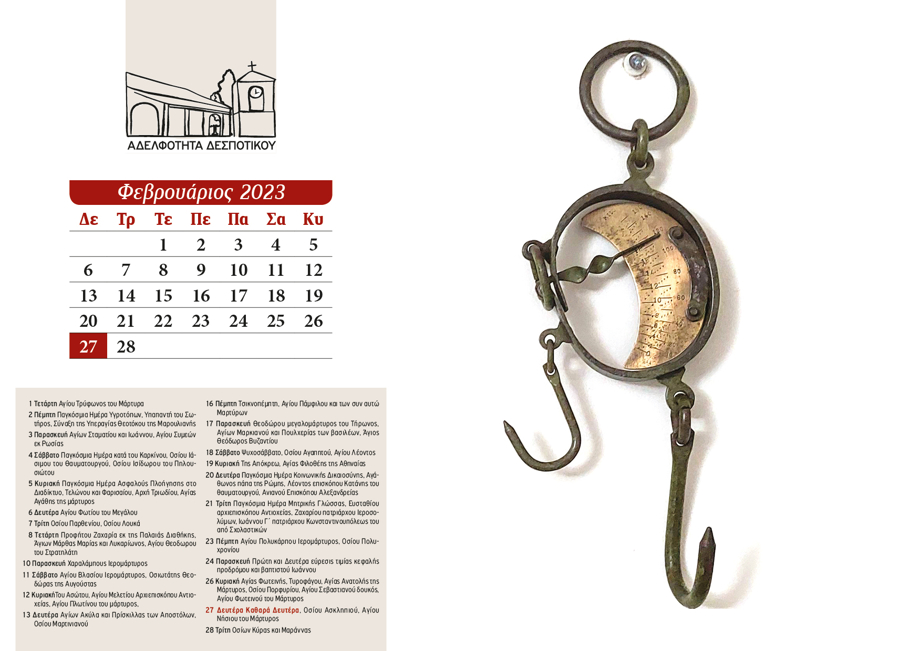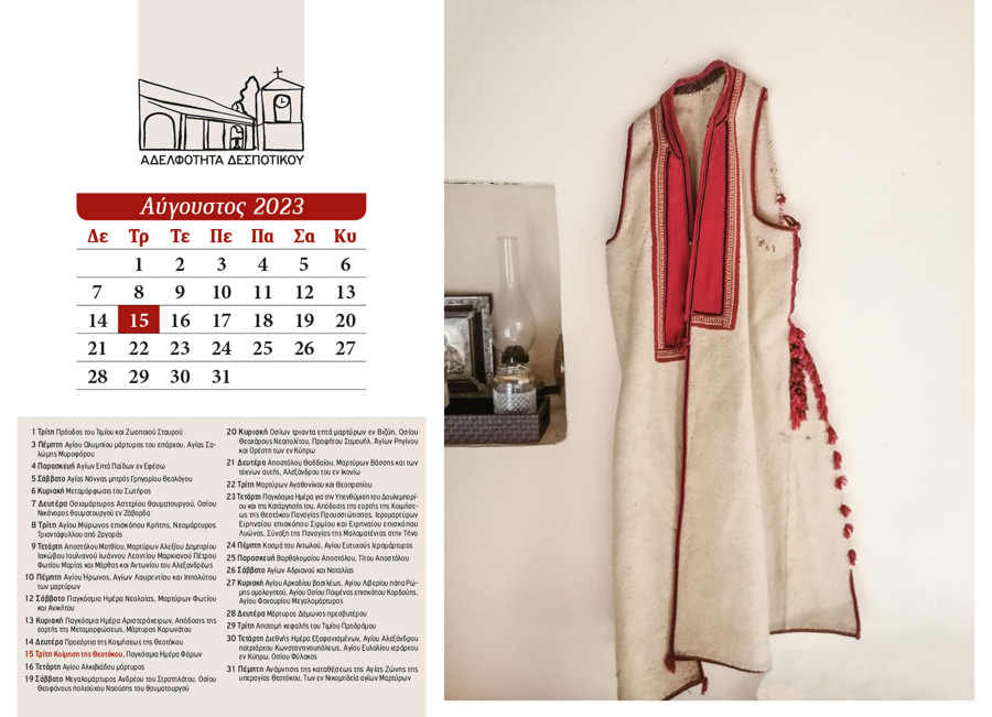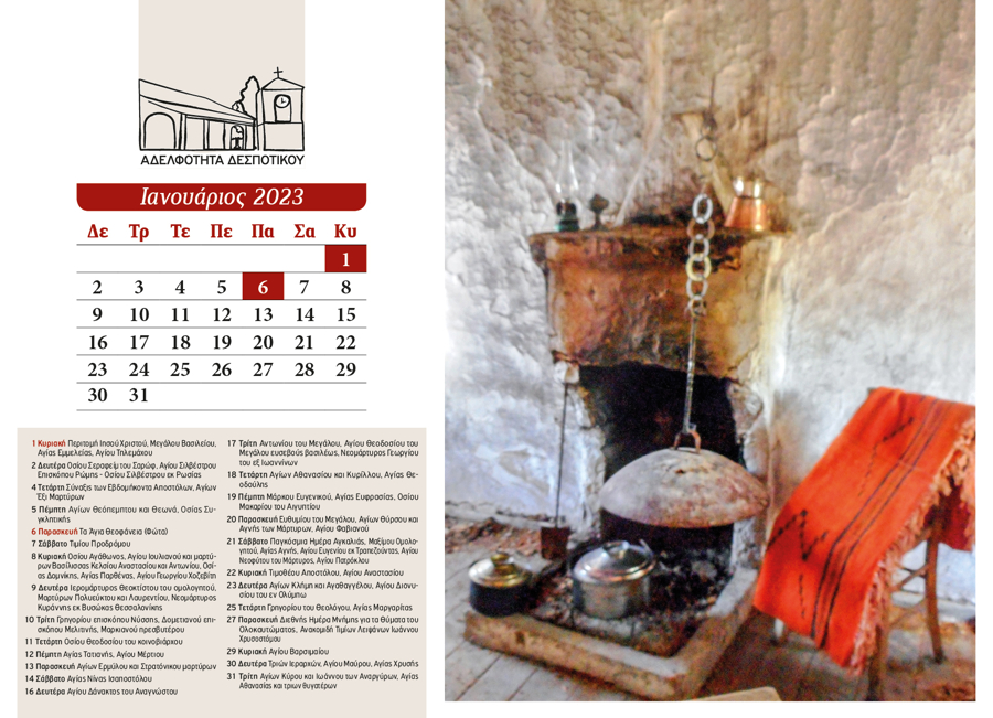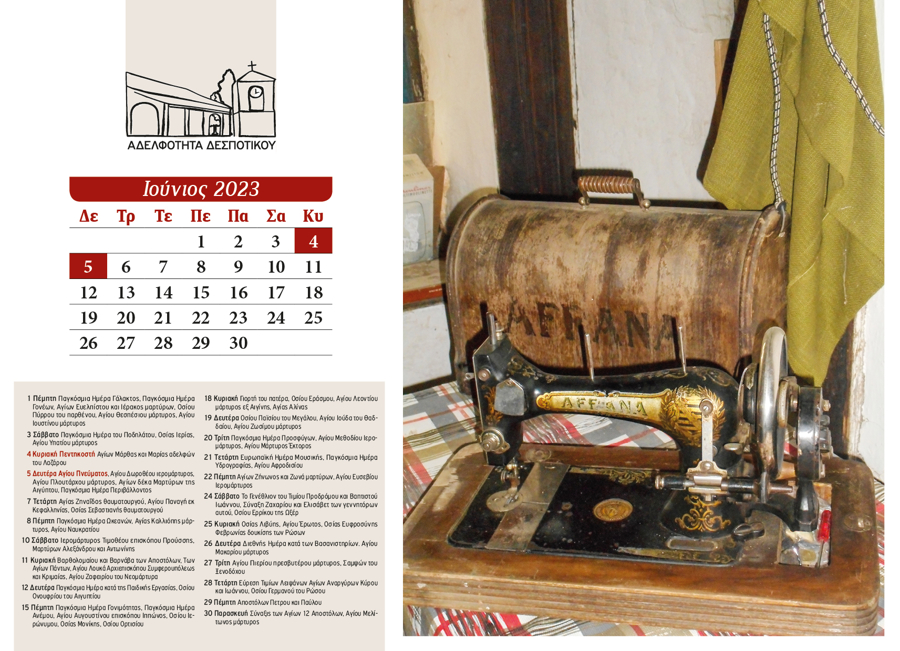 The 2024 calendar is dedicated to the landscape, memory, and quiet simplicity of Despotiko. Through photographs of natural and cultural landmarks—mountains, forests, springs, churches, monasteries, schools, and gathering places—it portrays village life as a continuous, shared experience. Nature, worship, and human presence coexist, turning the calendar into a subtle ritual of collective memory and reconnection.